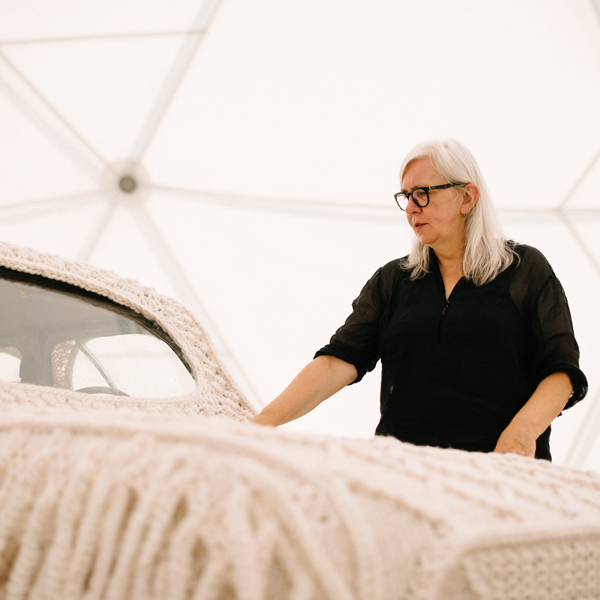 “Ik droomde ervan ooit iets in MIR te creëren. Iets groots, iets dat dicht bij mezelf ligt. Daarom besloot ik van mijn eerste auto een kunstwerk en statement te maken. Deze wagen staat voor mij symbool voor vrijheid en vergankelijkheid. In mijn jonge jaren vervoerde hij mij en mijn vrienden naar nieuwe bestemmingen. De auto wordt volledig omhuld door mijn breiwerk, waardoor je er niet meer in kan. Daarmee is het een afsluiting van een periode. Niet alleen voor mij, maar ook voor de tijd waarin we leven. Onze fossiele brandstoffen zijn niet oneindig, hoe we ons verplaatsen verandert drastisch. Het is een zacht vaarwel.”