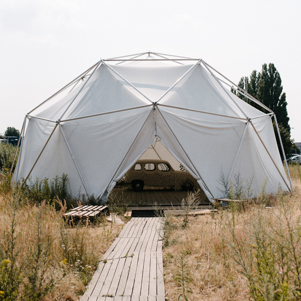 Middenin de robuuste omgeving van het Cobercokwartier staat een witte koepel. Schutkleuren heeft hij niet bepaald, maar toch lijkt het hier helemaal thuis te zijn. MIR is een reizend paviljoen waarin kunst en techniek zich samenvoegt. Iedere twee maanden huisvest het een ander artistiek of technisch project op een andere locatie. Op dit moment fungeert het als expositieruimte voor Caroline Evers, die hier haar gebreide creatie Beeldwit presenteert. Caroline breide een maand lang acht uur per dag om haar eerste auto, een Renault 4, van een aaibaar omhulsel te voorzien.